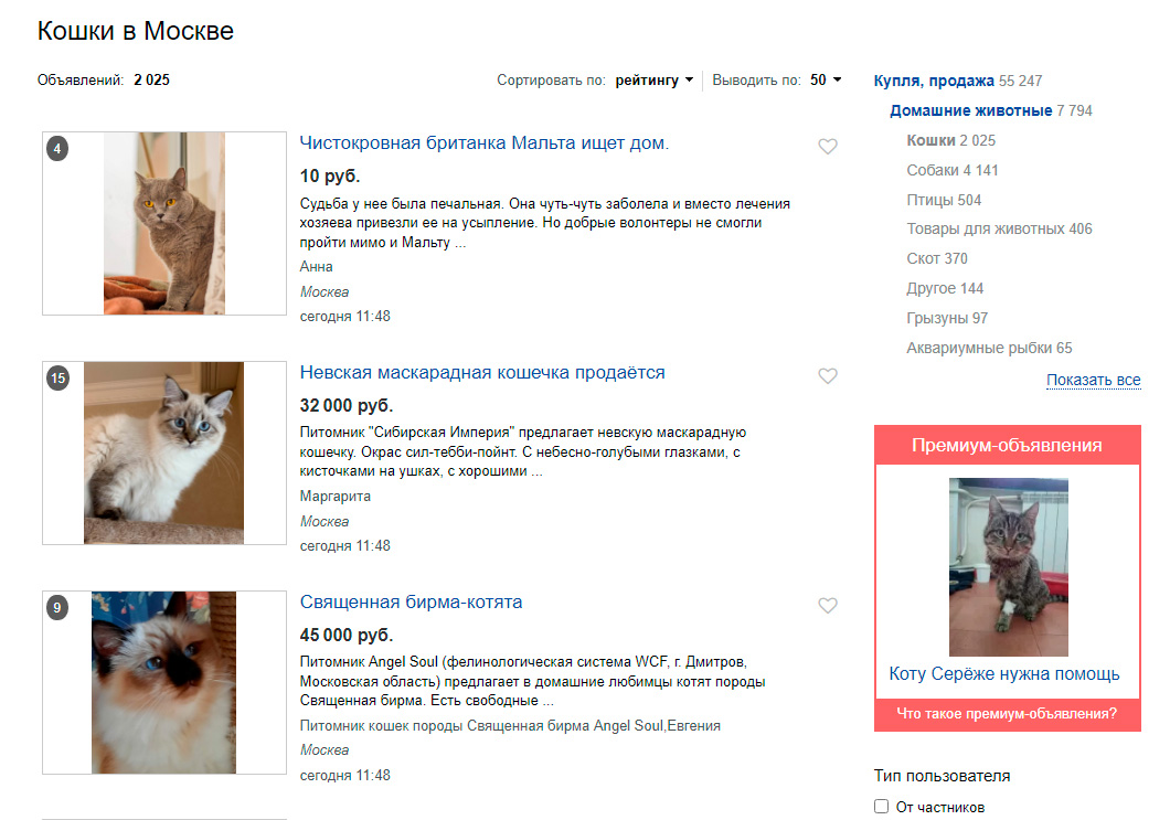 Премиум-объявление показывается в специальном Премиум-блоке в правой части сайта. Все объявления соответствуют поисковому запросу пользователя, городу и категории и показываются в случайном порядке.